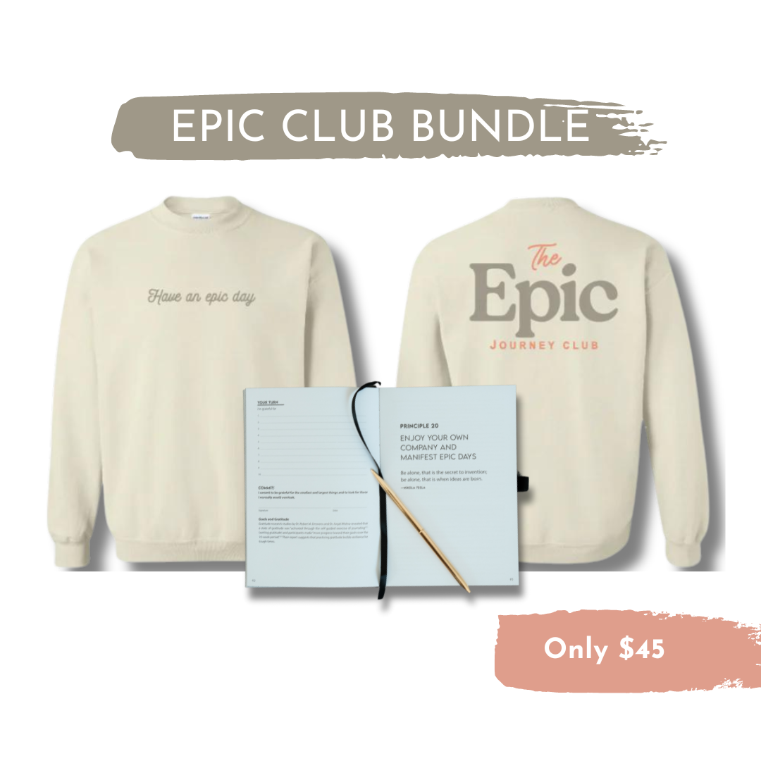 Embark on an adventure of self-discovery and creativity with our 'Have an Epic Day' sweatshirt and journal combo. Crafted with soft fabrics and adorned with a vibrant design, our sweatshirt not only keeps you cozy but also serves as a reminder to seize every moment with gusto. Pair it with our Epic Journal, a companion for your journey through life's epic tales. With its sleek design and quality paper, this journal is the perfect canvas for your thoughts, dreams, and adventures. Whether you're conquering mountains or conquering your innermost fears, let our 'Have an Epic Day' ensemble be your armor, inspiring you to embrace every day as a grand adventure.