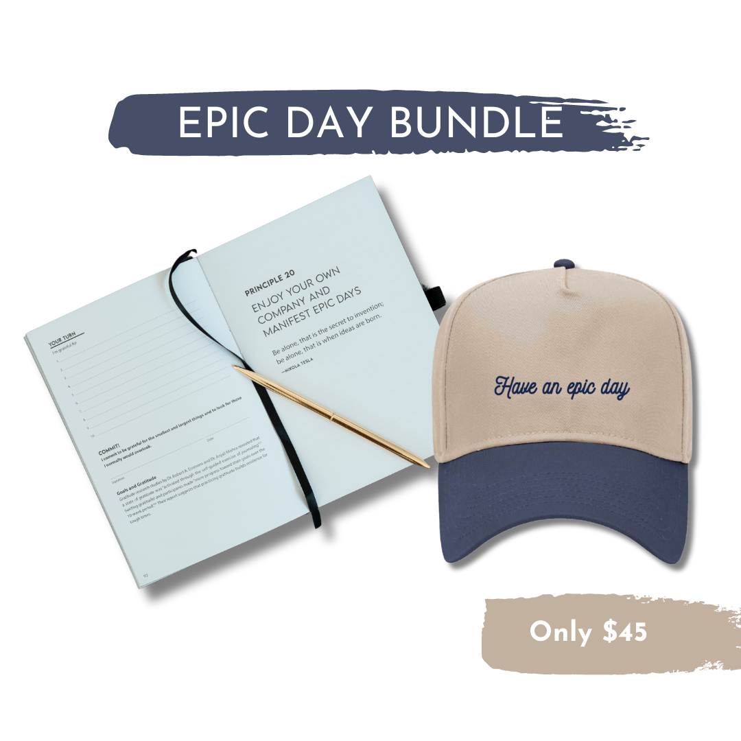 Elevate your daily routines and infuse each moment with inspiration with the Epic Journal and "Have an Epic Day" hat. The Epic Journal is a sanctuary for your thoughts, dreams, and aspirations, crafted with premium materials and designed to accompany you on your journey of self-discovery and growth. With its luxurious pages and portable design, it invites you to capture your ideas and reflections wherever you go. Paired with the "Have an Epic Day" hat, you'll carry a tangible reminder to seize every opportunity and make each day extraordinary. Crafted with care and featuring a timeless design, this hat exudes positivity and encourages you to approach each day with enthusiasm and optimism. Together, the Epic Journal and "Have an Epic Day" hat inspire you to embrace the beauty of life's journey and make every day a masterpiece.